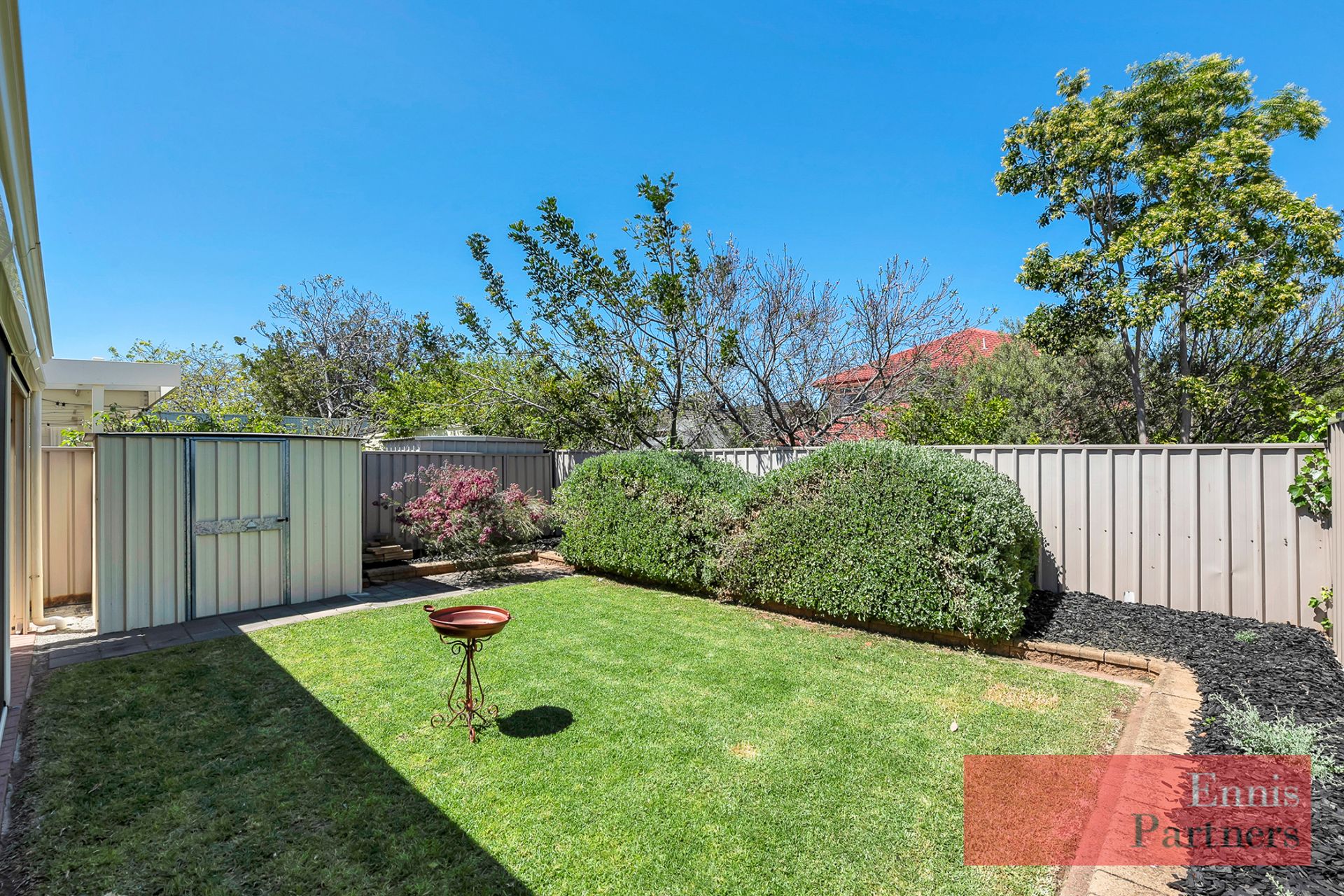 Lush lawned garden and garden shed